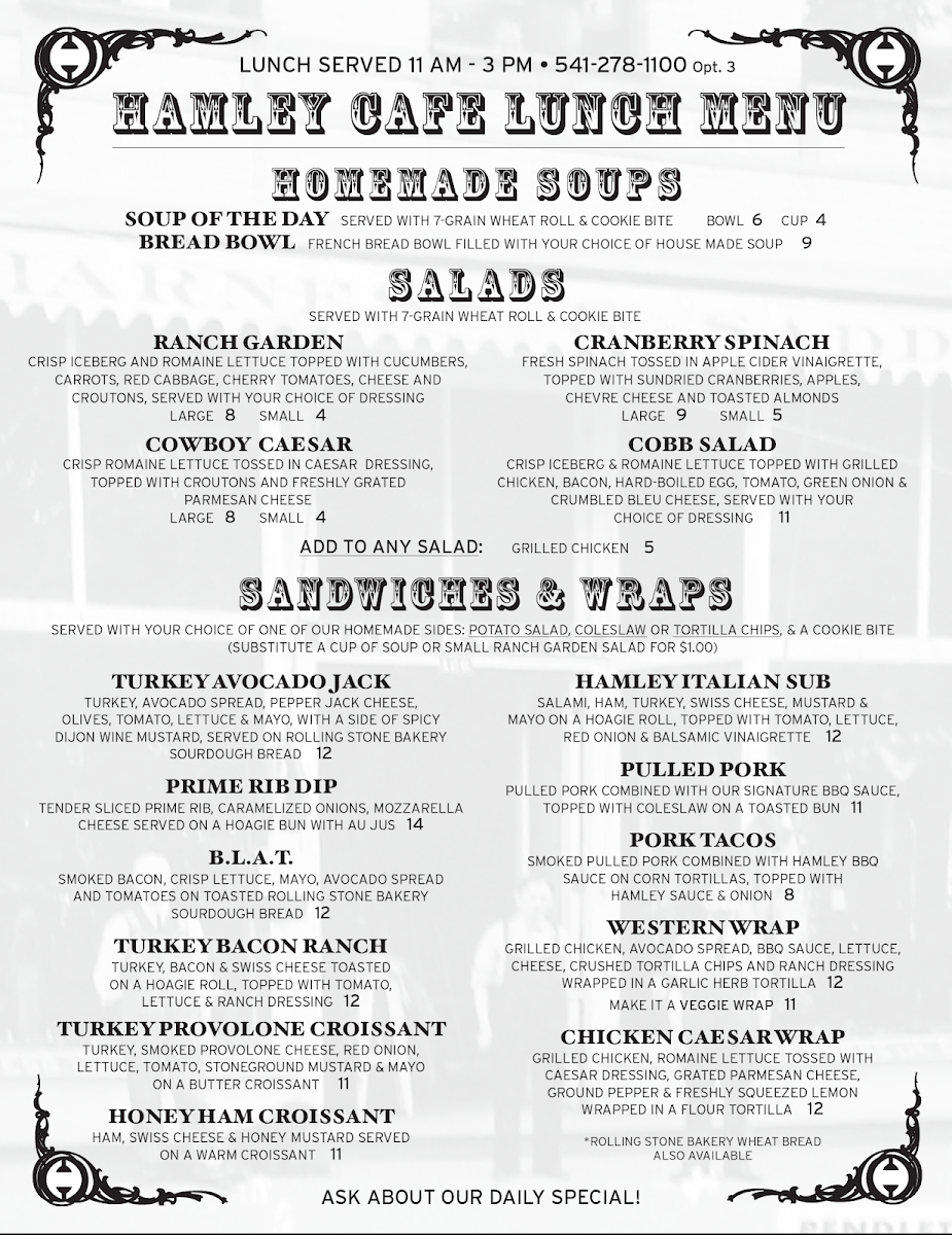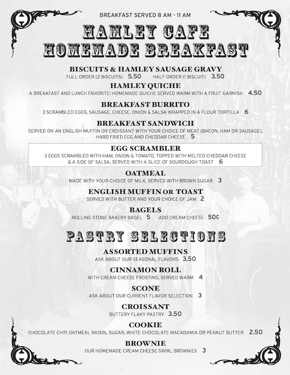 The menu at Hamley Cafe is a delightful exploration of homemade comforts. Start with their Soup of the Day, served in a cozy bread bowl that's perfect for chilly afternoons. If you're in the mood for something crisp and refreshing, try one of their vibrant salads, such as the Cranberry Spinach or the classic Cobb Salad, which bursting with flavor and freshness. Breakfast lovers will be particularly pleased with the array of options, including the savory Breakfast Burrito and delightful Biscuits with Hamley Sausage Gravy, both of which will have you coming back for another taste. For something sweet to start your day, their warm bagels and oatmeal are sure to hit the spot.